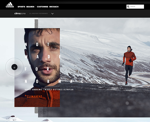 Adidas webpage with widely spaced font over images of jogger in a snowy mountain setting.