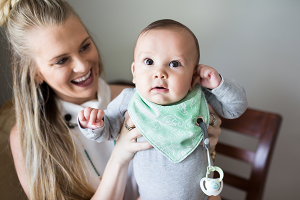 Mother holding up baby wearing bandana bib with attached pacifier.