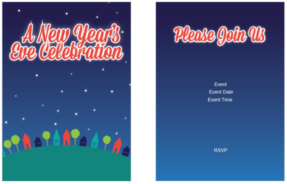 Starry sky with silhouette of houses and trees on a hill 5×7 postcard party invitation template