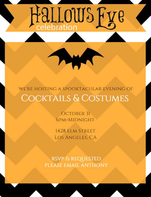 Orange Hallows Eve Celebration party invitation with bat silhouette and black and white chevron background
