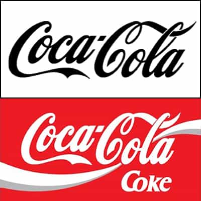 Black script Coca-Cola logo on top and white script Coca-Cola logo with white ribbon and red square background at bottom.