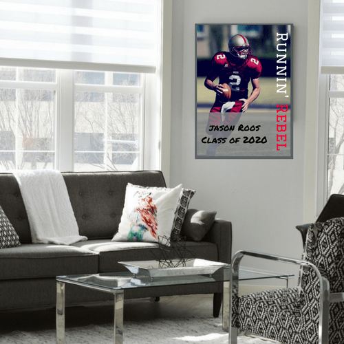 Poster of college football player running on field with ball in hand.