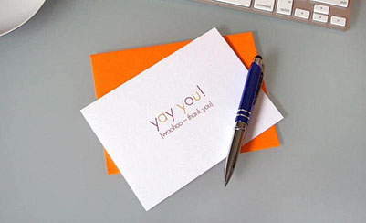 Minimalist white corporate thank you card on top of bright orange envelope resting under fountain pen on office desk.