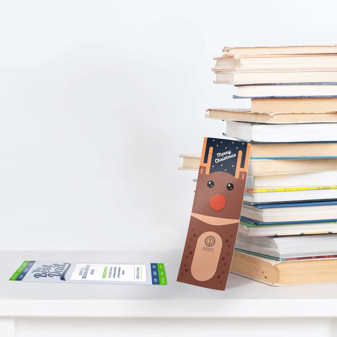 Holiday themed bookmark leaning against stack of hardcover books