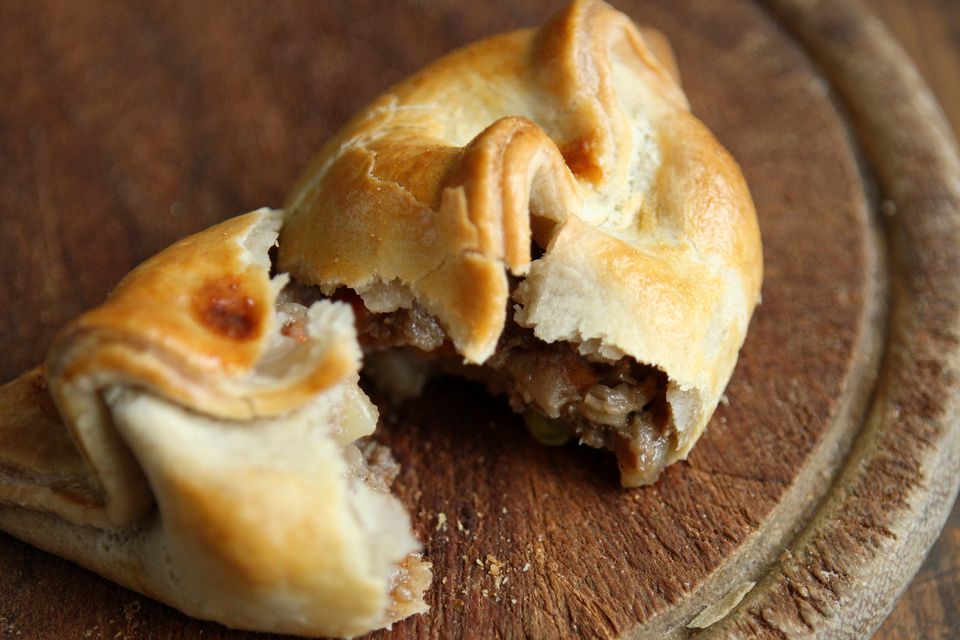 Perfectly cooked British cornish pastry, broken open to reveal what’s inside