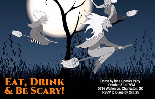 Three gray witches flying on broomsticks above grass field with full moon backgroun