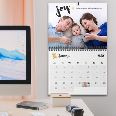 2018 photo wall calendar of couple with baby hanging on home office wall.