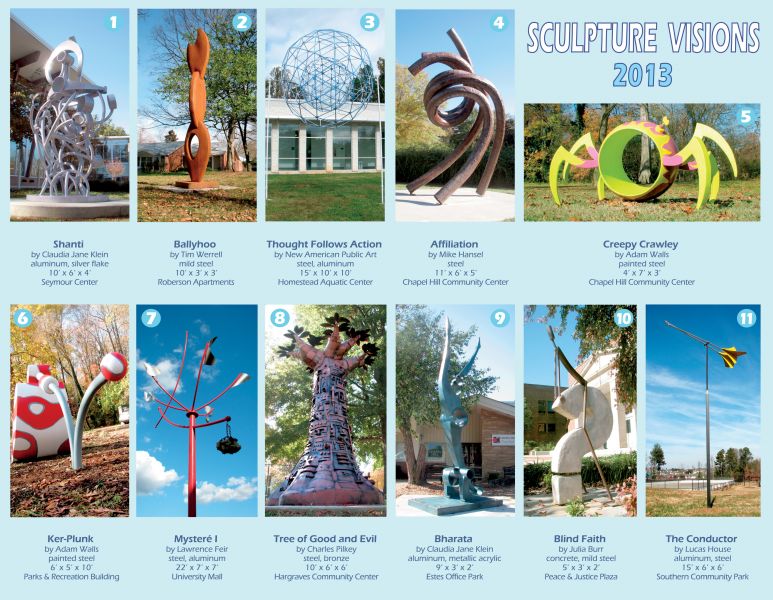 Sculpture Visions is an outdoor art exhibit in Chapel Hill, NC, featuring exquisite artwork. Guests can use this promotional brochure as a handy map guide as well as an elegant keepsake.