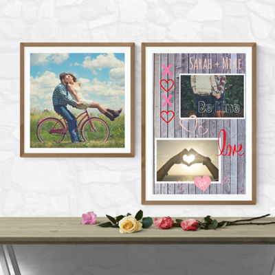 Framed wall photos of couple riding a bike on a field and oversized greeting card with personal images.