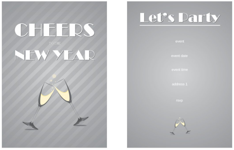 Two champagne flutes clinking against gray diagonal stripe background 5×7 double sided postcard invitation template