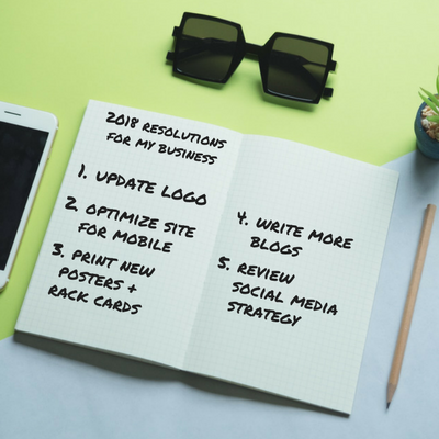 Open notebook on blue and green pastel desk next to iPhone, square sunglasses and pencil.