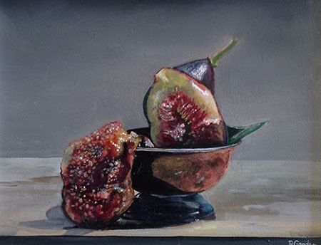 Oil painting by Randy Groden of two halves of a fig in a silver bowl.