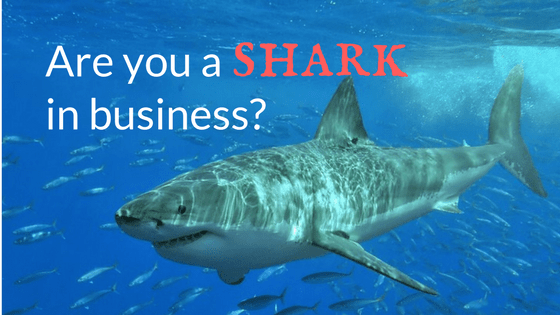 Shark swimming underwater surrounded by a school of small fish.