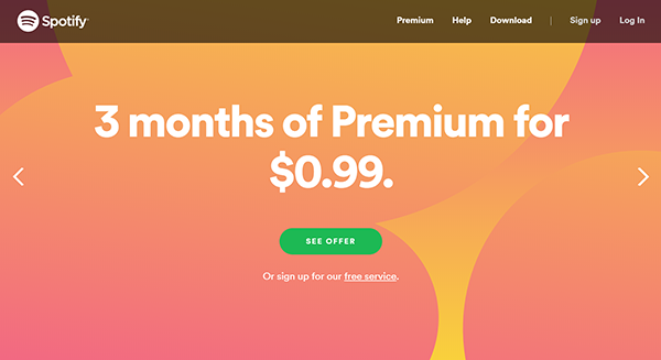 Spotify website with gradient floating circles in coral and yellowish orange.