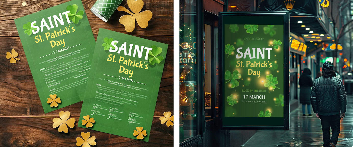 Sie möchten Ihre St. Patrick’s Day-Angebote oder Events bewerben? Flyer und Poster sind perfekte Klassiker, um Aufmerksamkeit zu gewinnen. Gestalten Sie sie mit Kleeblättern, Goldmünzen oder Koboldhüten – so bringen Sie Spaß und wichtige Infos zusammen.