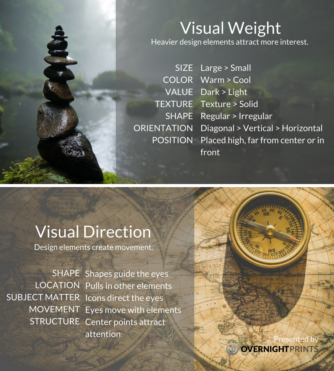 Visual weight characteristics with dark stone cairn at mouth of river background, and visual direction characteristics with historic world map and gold colored compass background